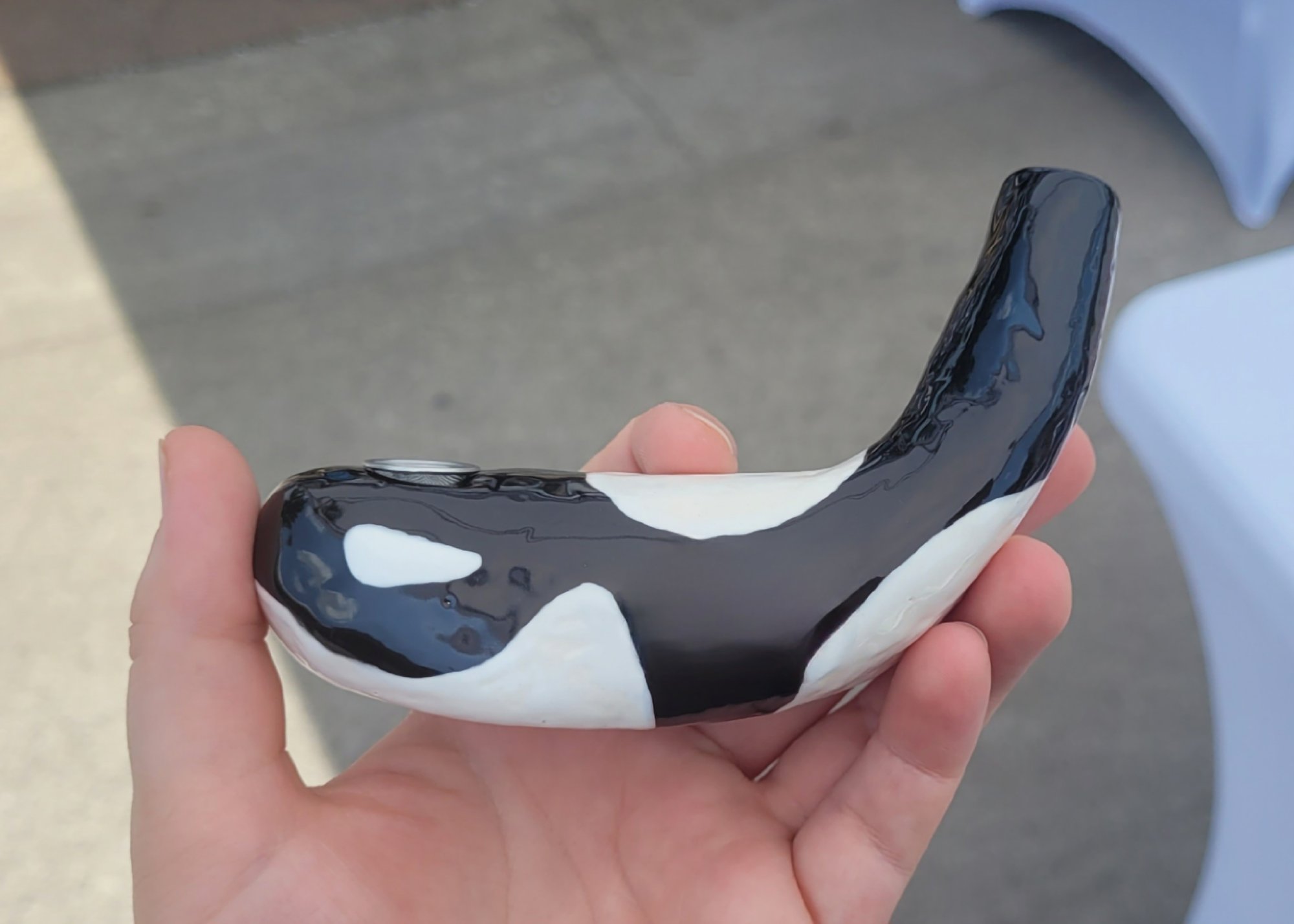 These handmade Orca pipes are both beautiful and functional. Each pipe comes with a mesh bowl and measures 5" long, 3" tall.